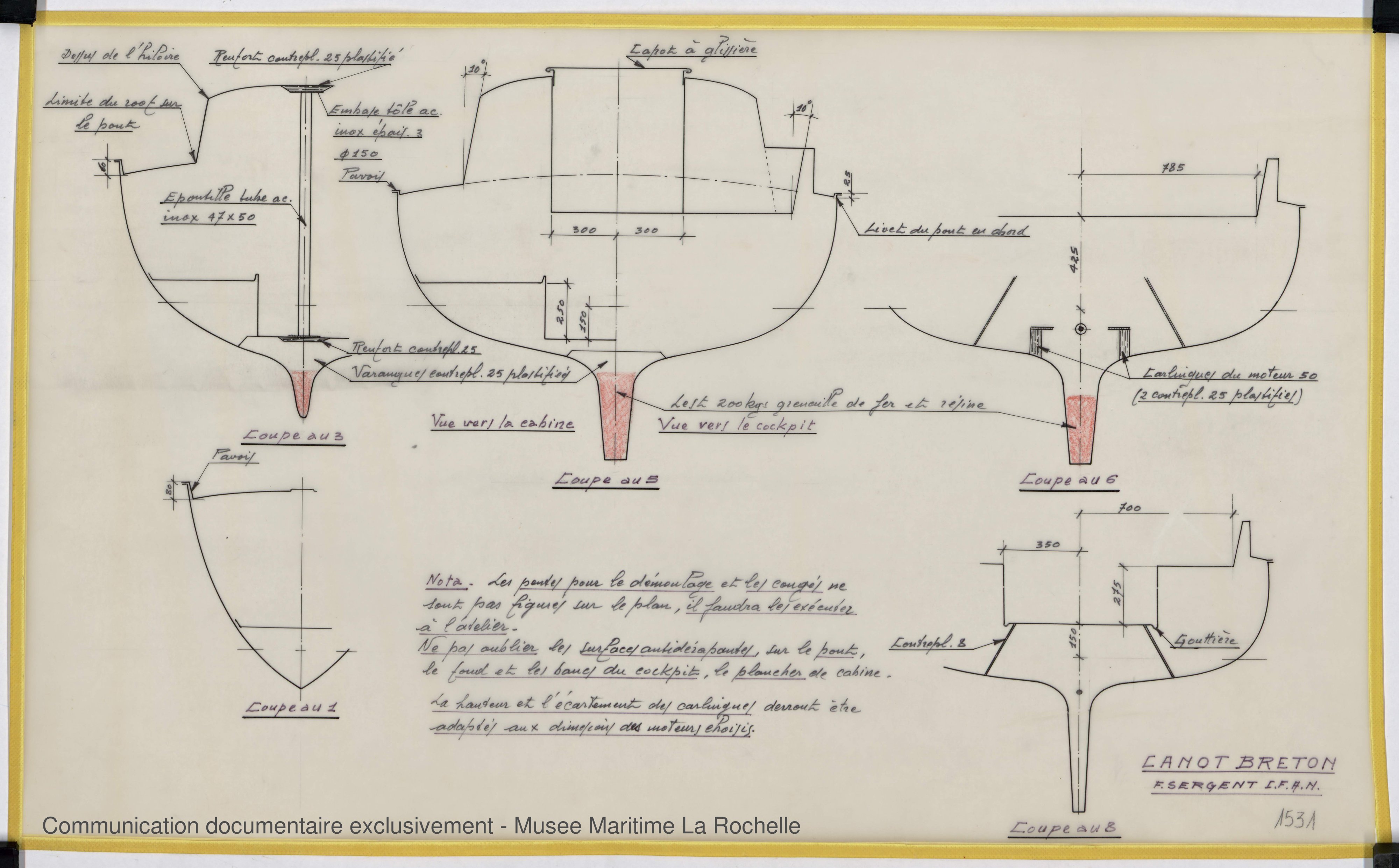 Les bénévoles des Archives du Yachting ont choisi d’utiliser des noms de plans susceptibles de convenir à d’autres fonds d’architectes navals à venir. Cela peut expliquer les différences d’appellation entre les noms donnés par François Sergent lui-même et ceux du site.
